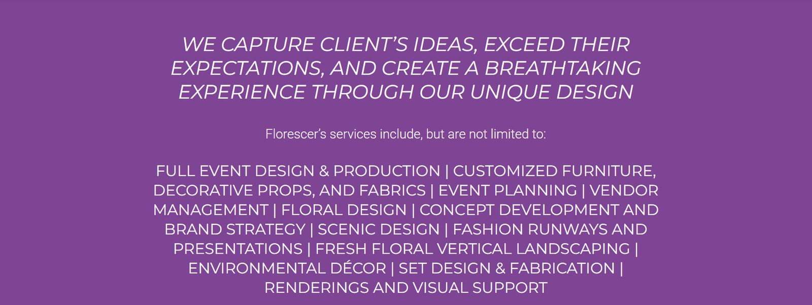 Florescer is a full service production company that elevates ordinary events to extraordinary experiences using flowers as our primary artistic vehicle. Our talented team designs the most celebrated events worldwide with a broad range of clientele in the entertainment, fashion, publishing, arts, media, and consumer product industries.With more than 15 years of experience, our team brings creative innovation to flowers and custom decor as well as every other aspect of event production including venue selection, invitations, catering, entertainment and integrated branding. We look forward to making your next event flourish!